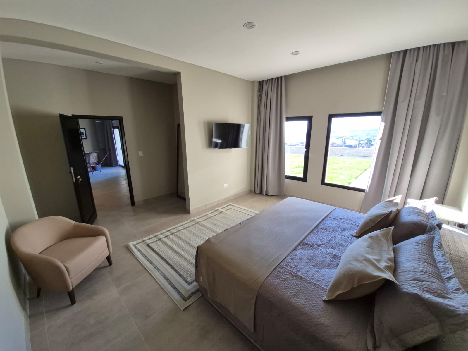 Cuentan con cocina completa (microondas, pava eléctrica, frigobar), TV Smart de 55”, Wi-Fi, climatización por losa radiante y aire acondicionado. Los amplios ambientes luminosos incluyen cama king, escritorio, sillón y grandes ventanales con vista a la ciudad.