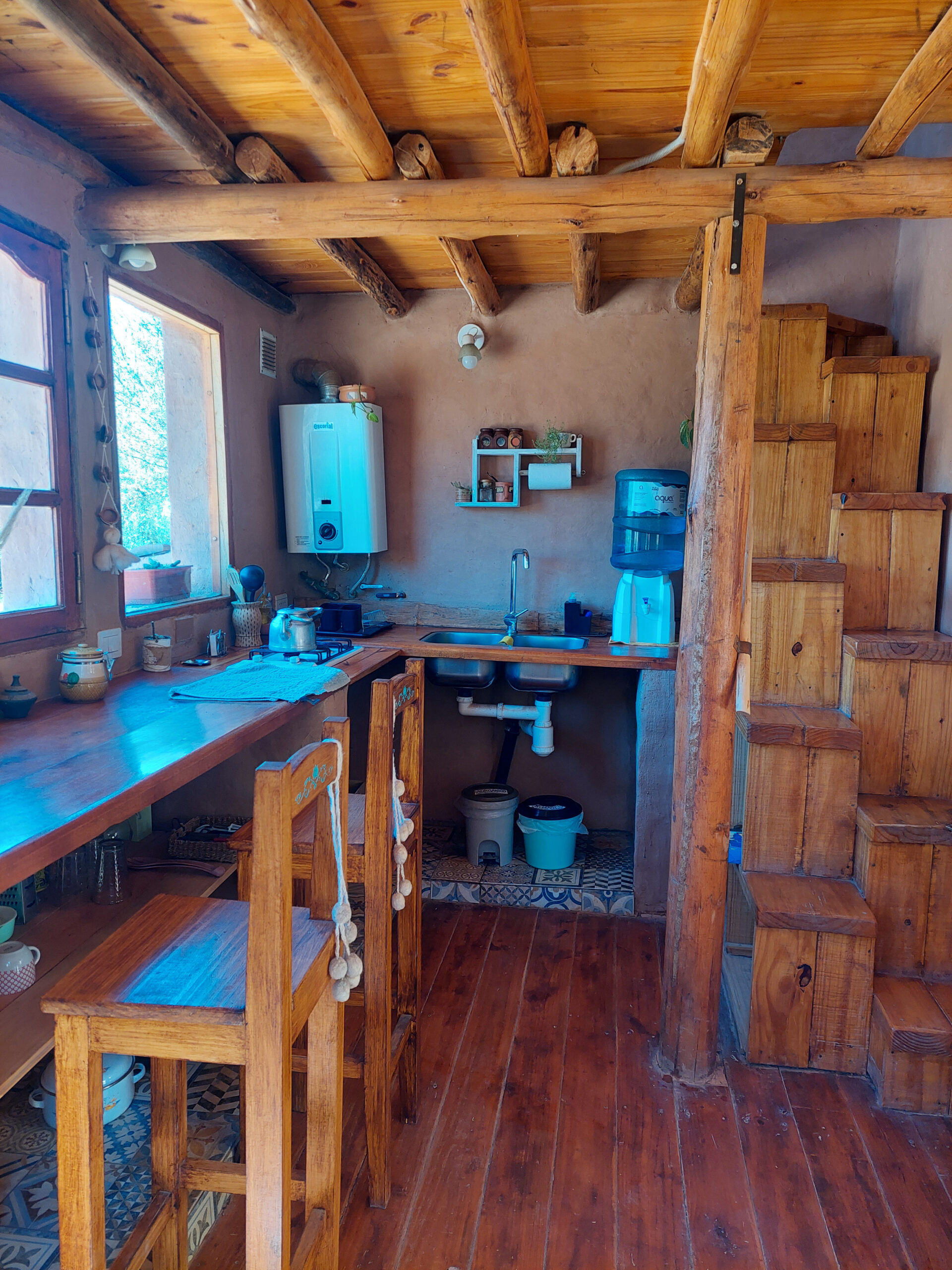 Con la cocina comedor en la planta baja y el dormitorio en la planta alta con ventanales con vista a los cerros que la rodean.
