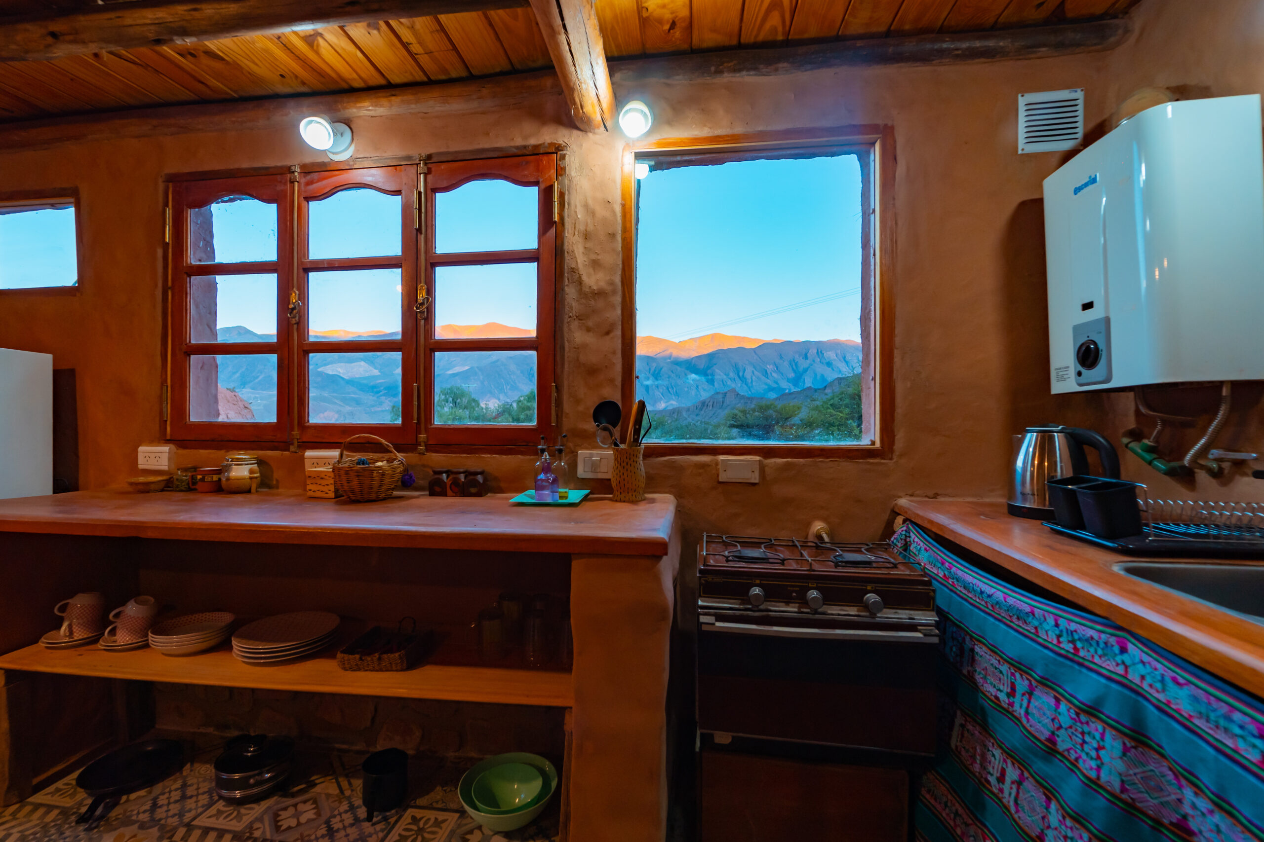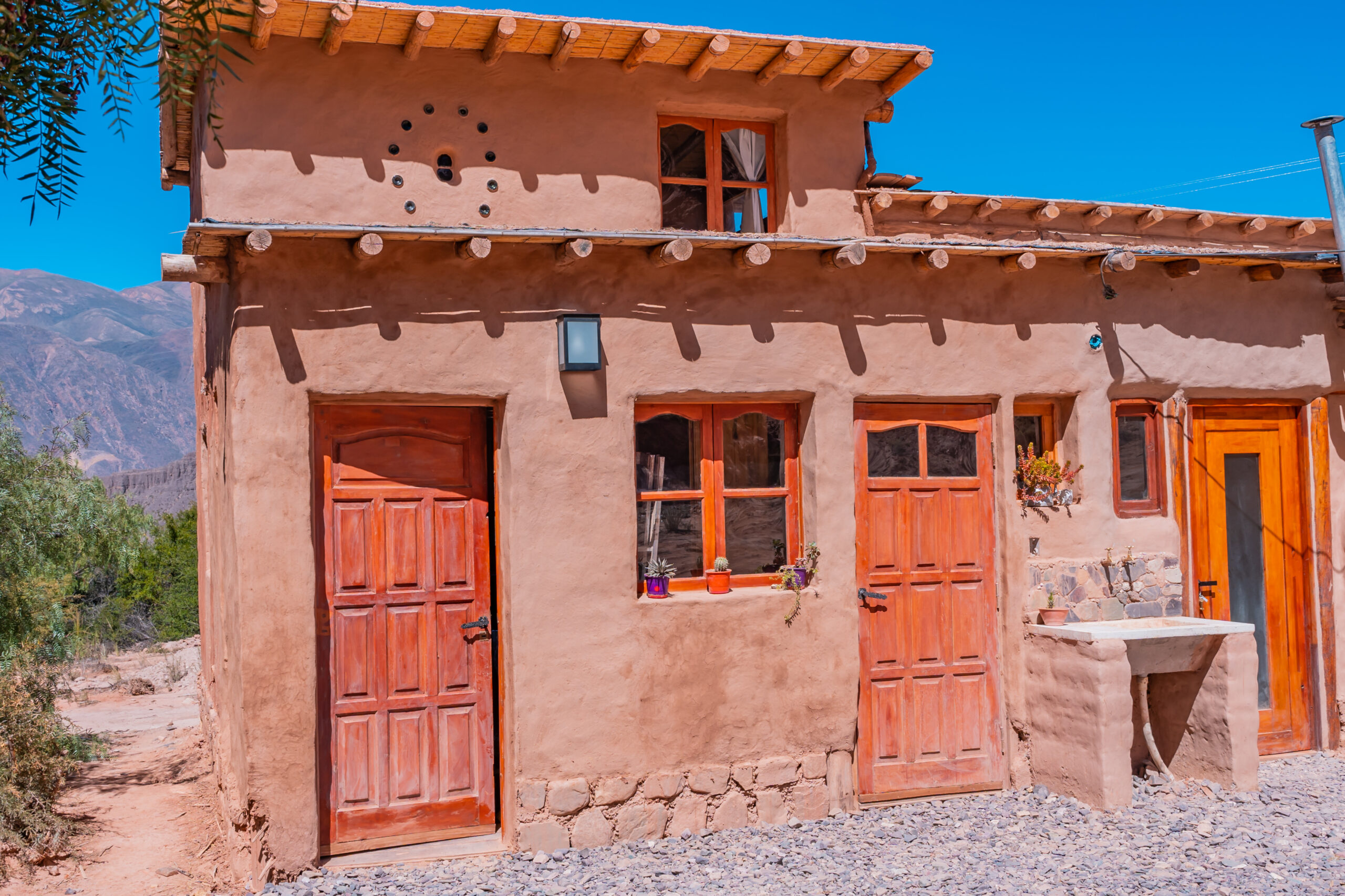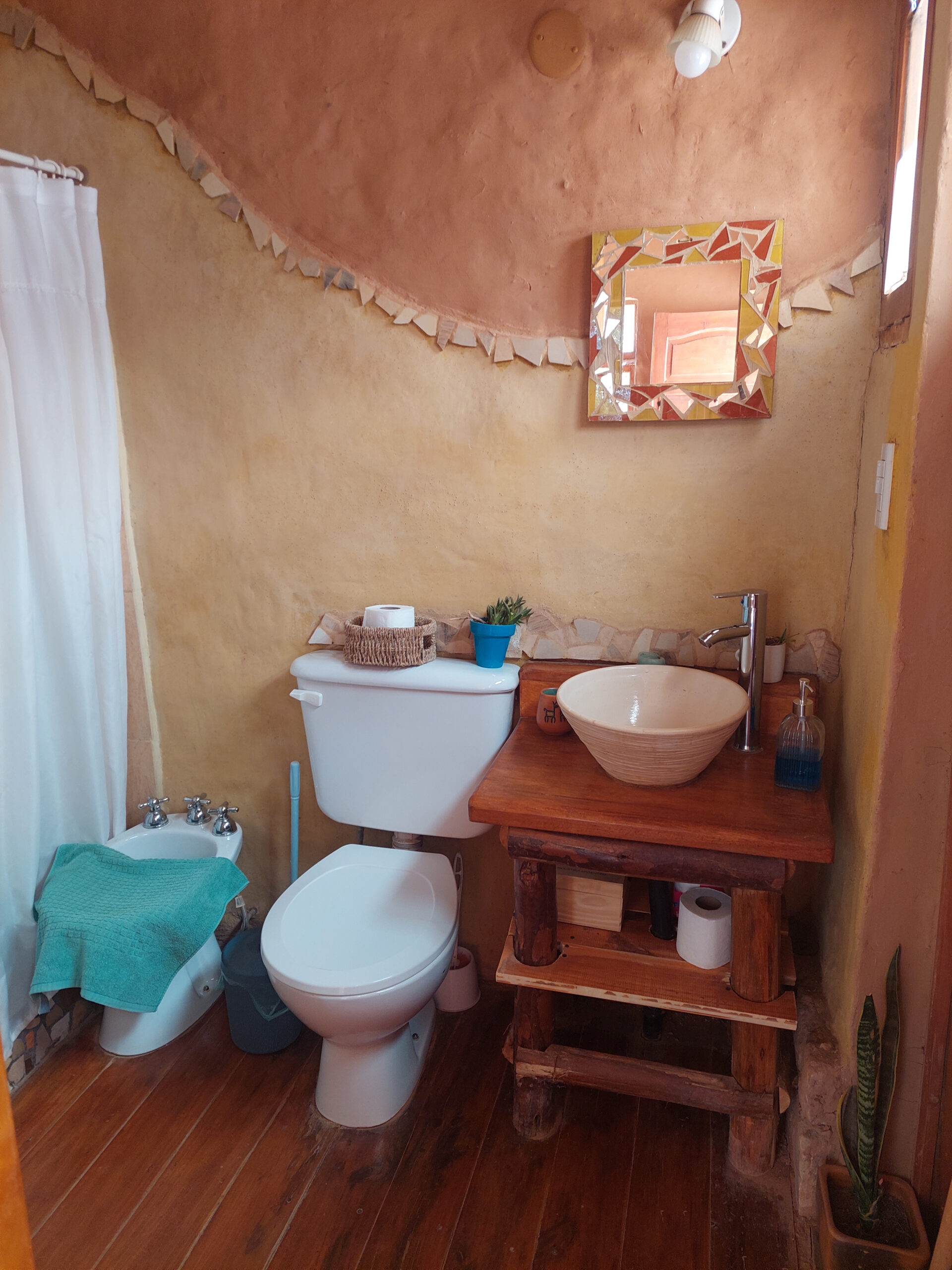 Esta construida mayormente con materiales naturales de la zona (barro, piedra, madera), e intentamos reducir lo más posible el impacto hacia la Madre Tierra.
