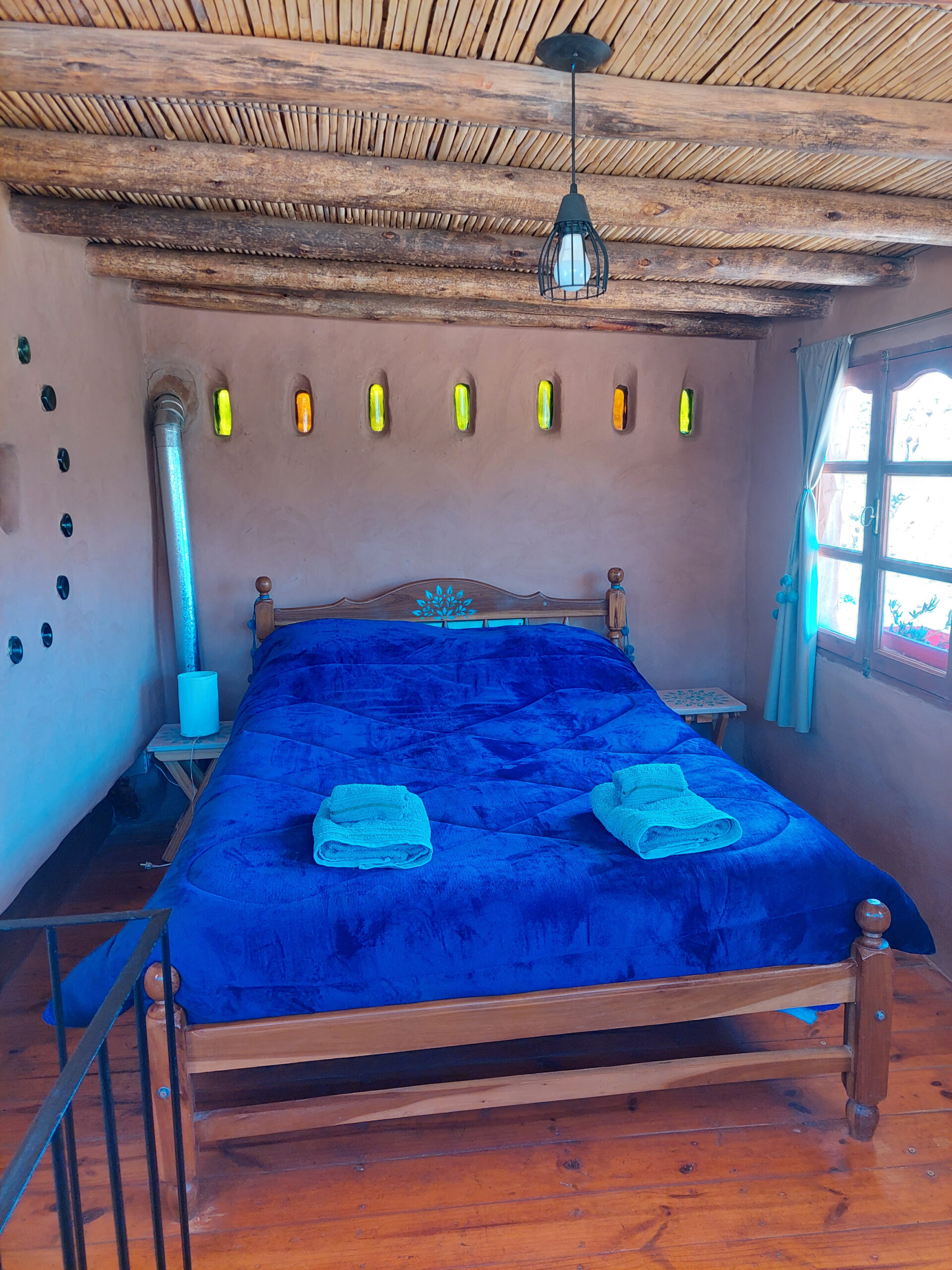 Es rústica y acogedora, construida con materiales de bio construcción, amigable con su entorno.