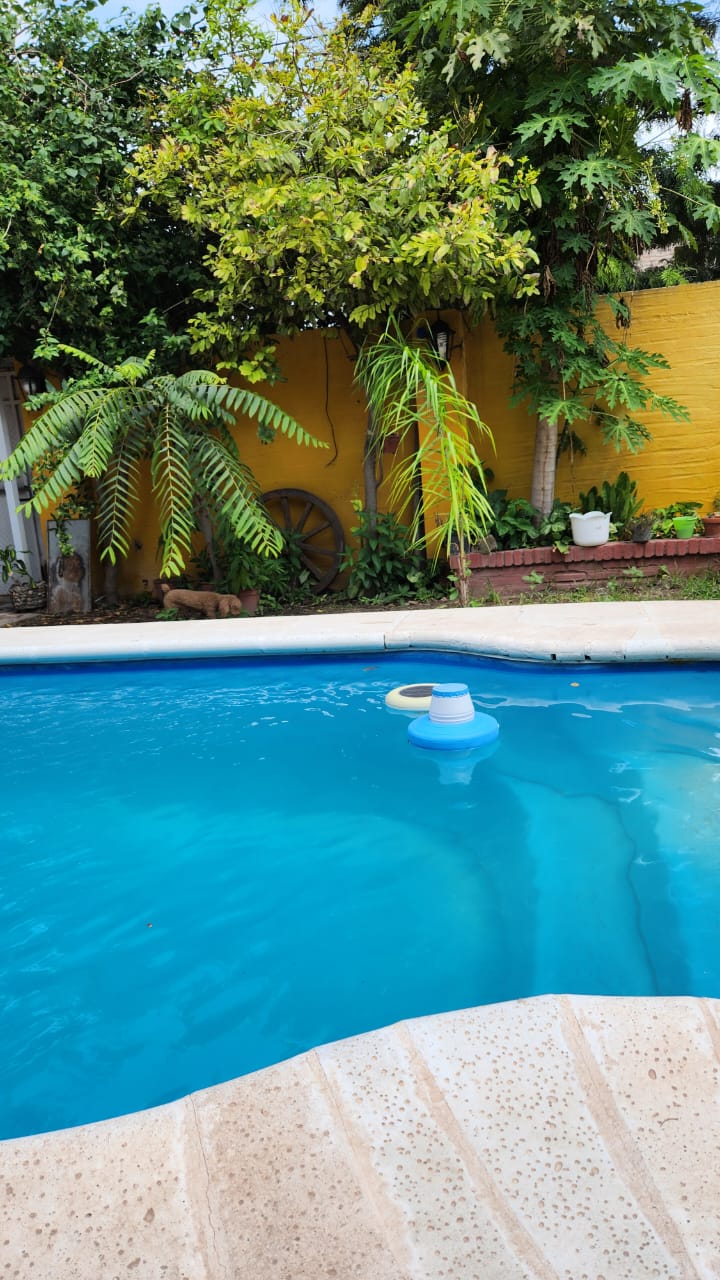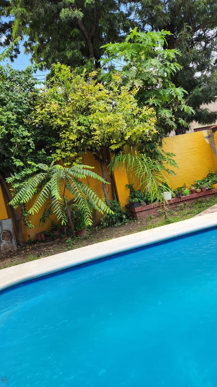El patio con pileta y vegetación es perfecto para disfrutar al aire libre o tomar unos mates bajo el sol.