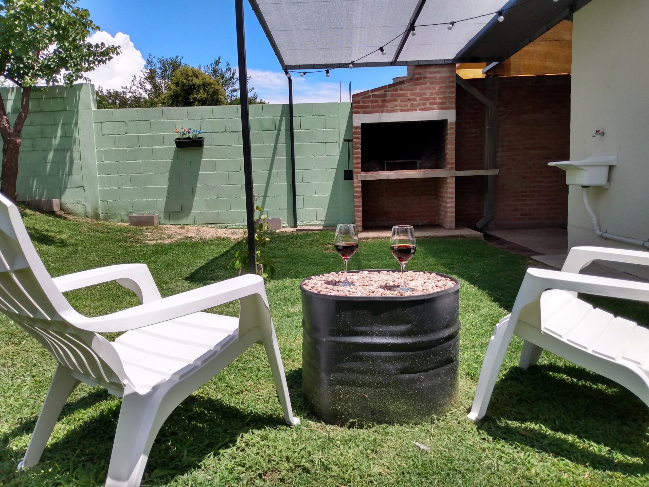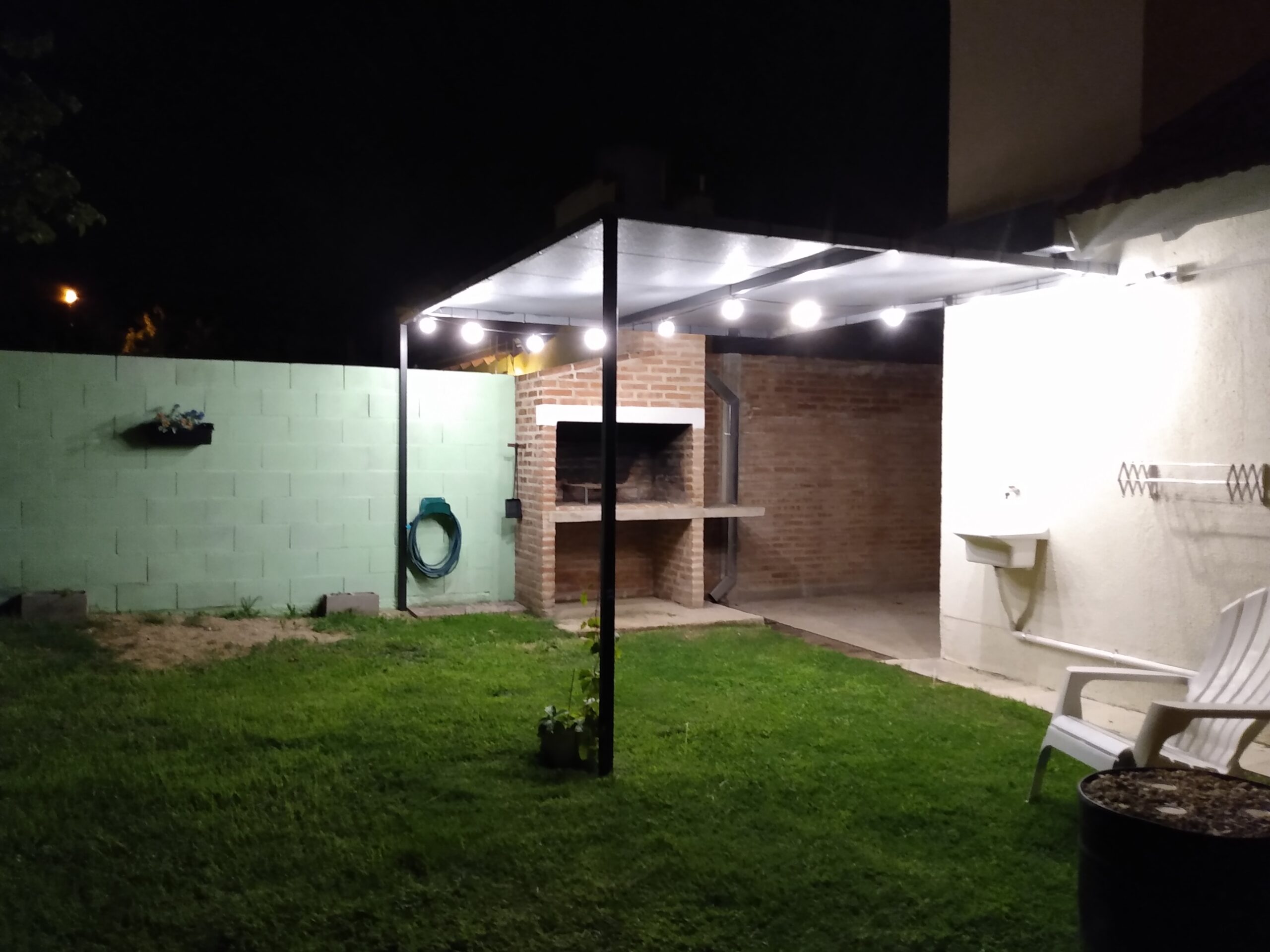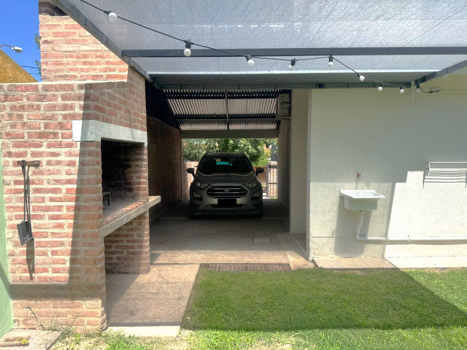 Un hermoso jardín con asador, pileta de lavar y tender.