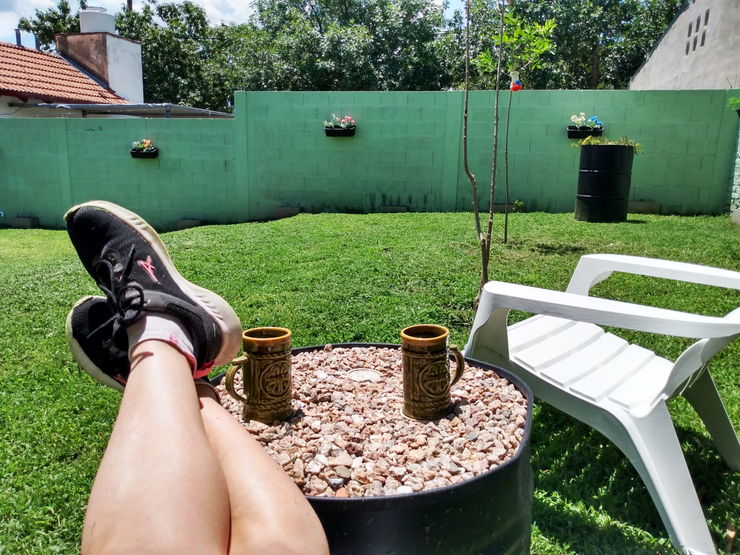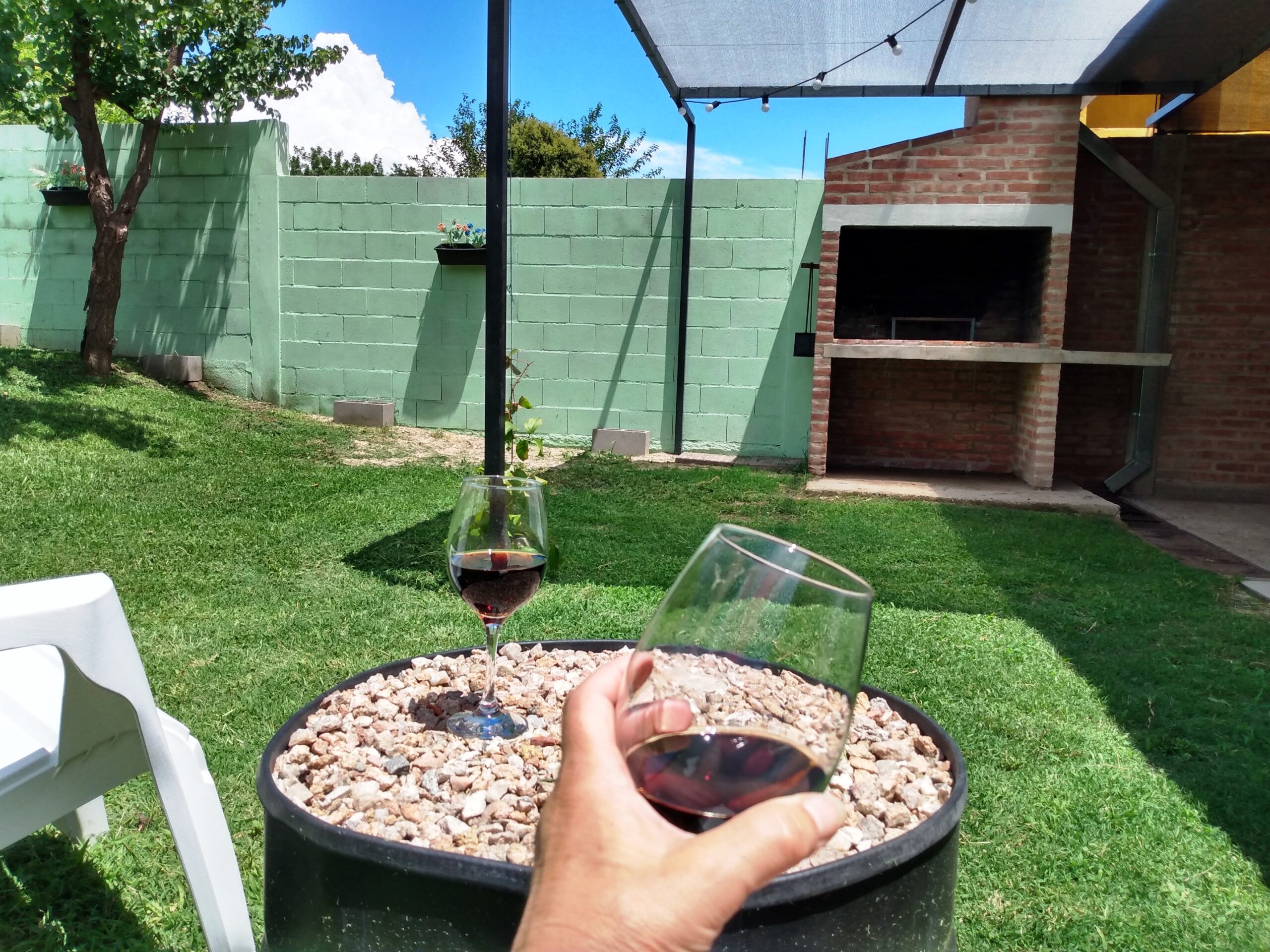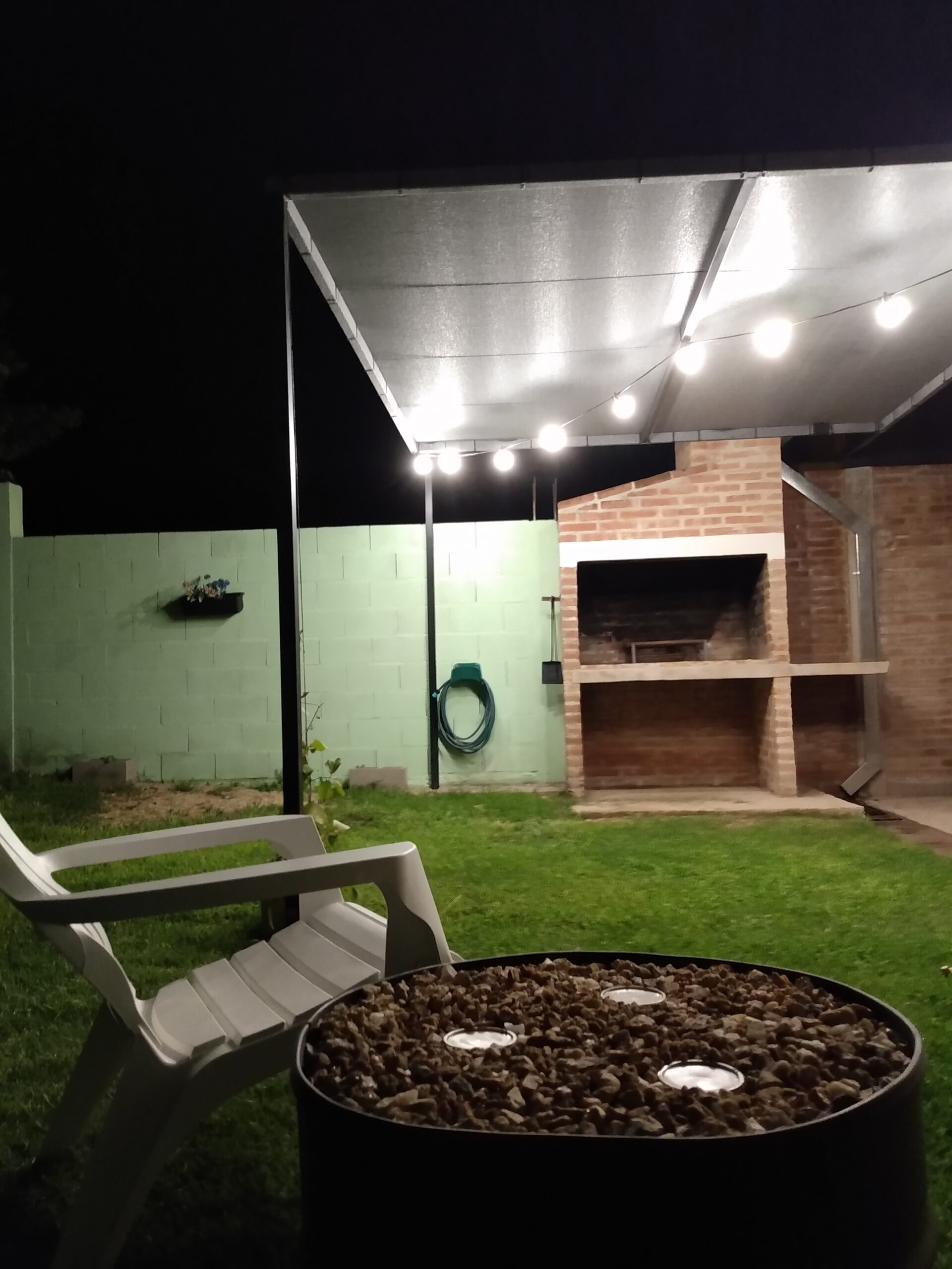 Un hermoso jardín con asador, pileta de lavar y tender.