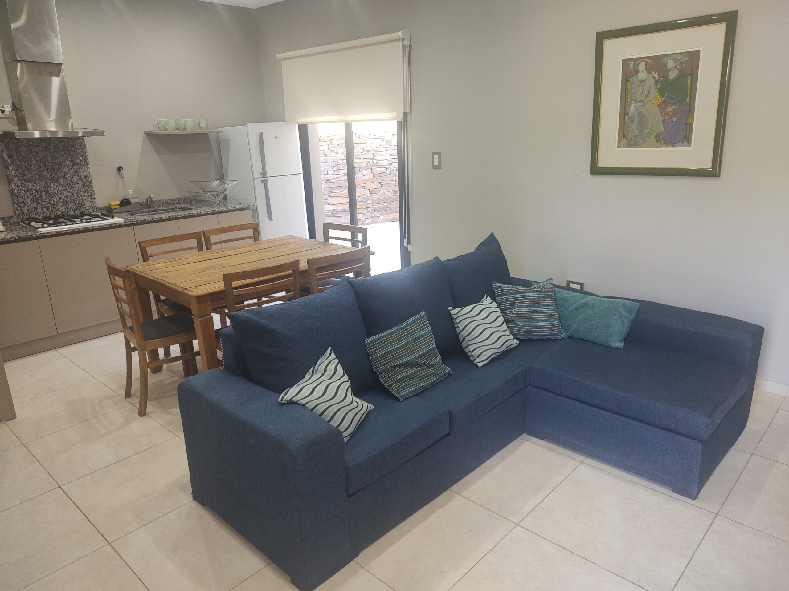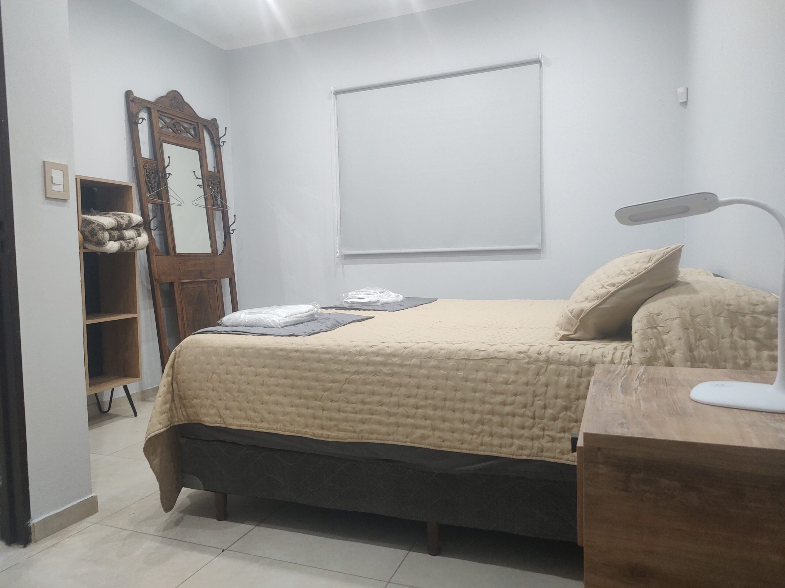 Casa entera, cocina comedor amplia, dos dormitorios grandes, baño amplio, cochera propia. Sommier king o plaza y media, sábanas y toallas blancas