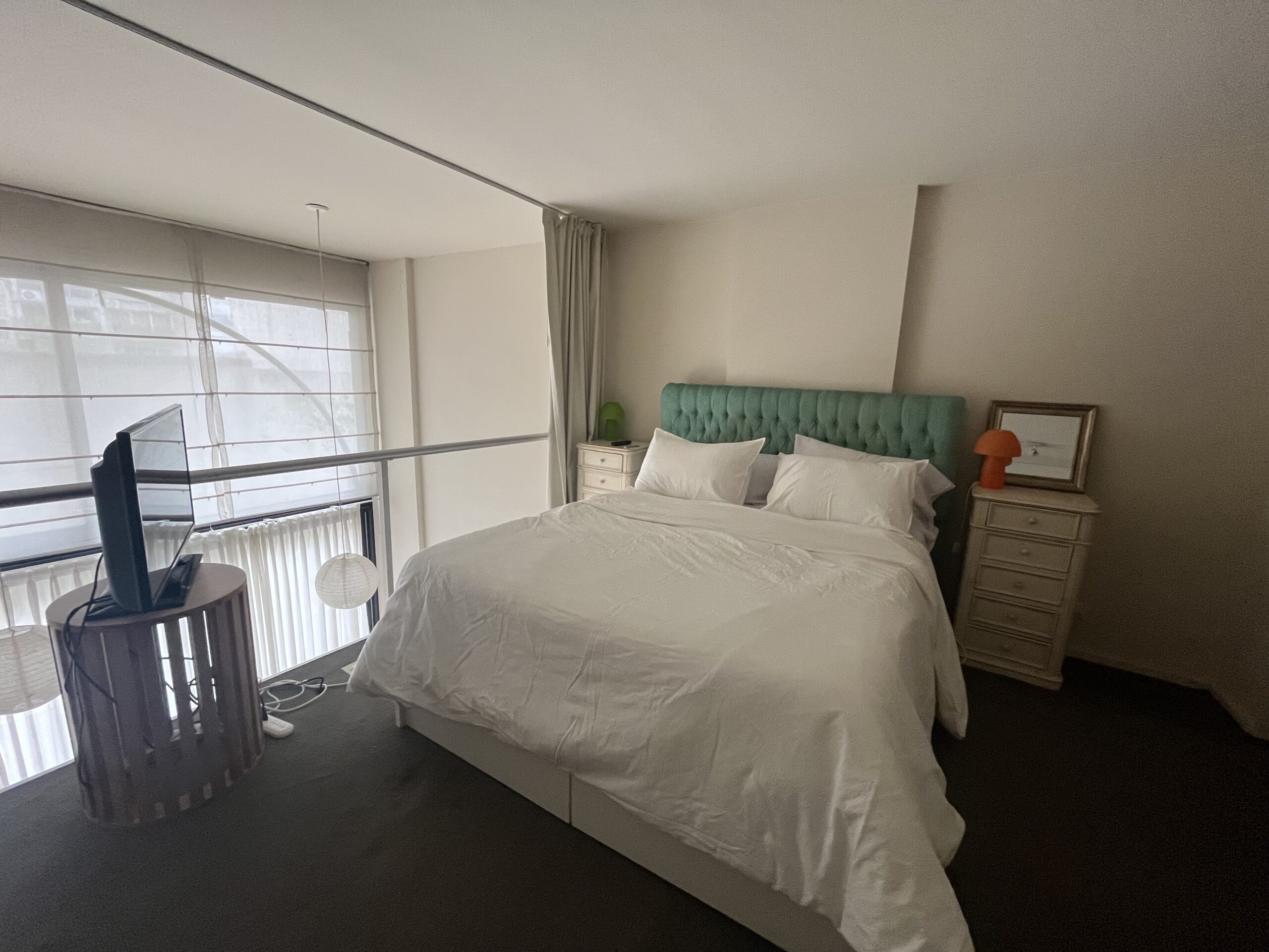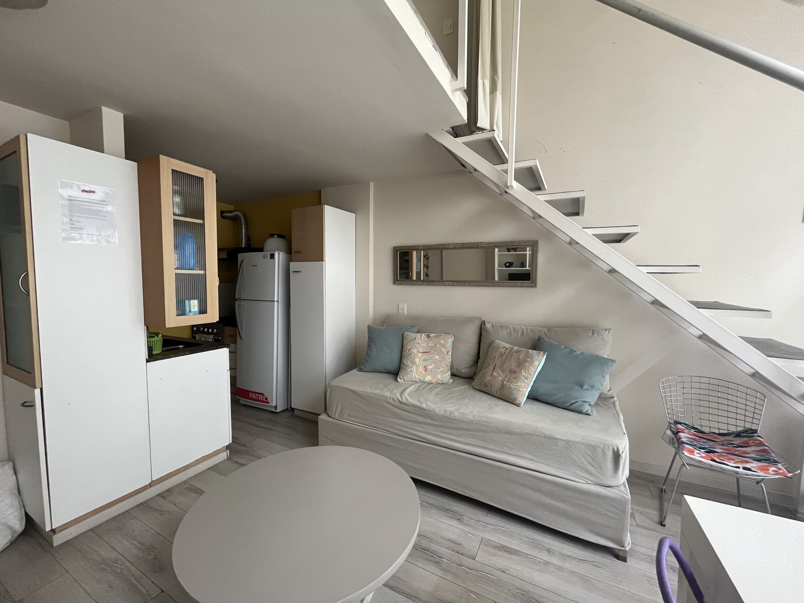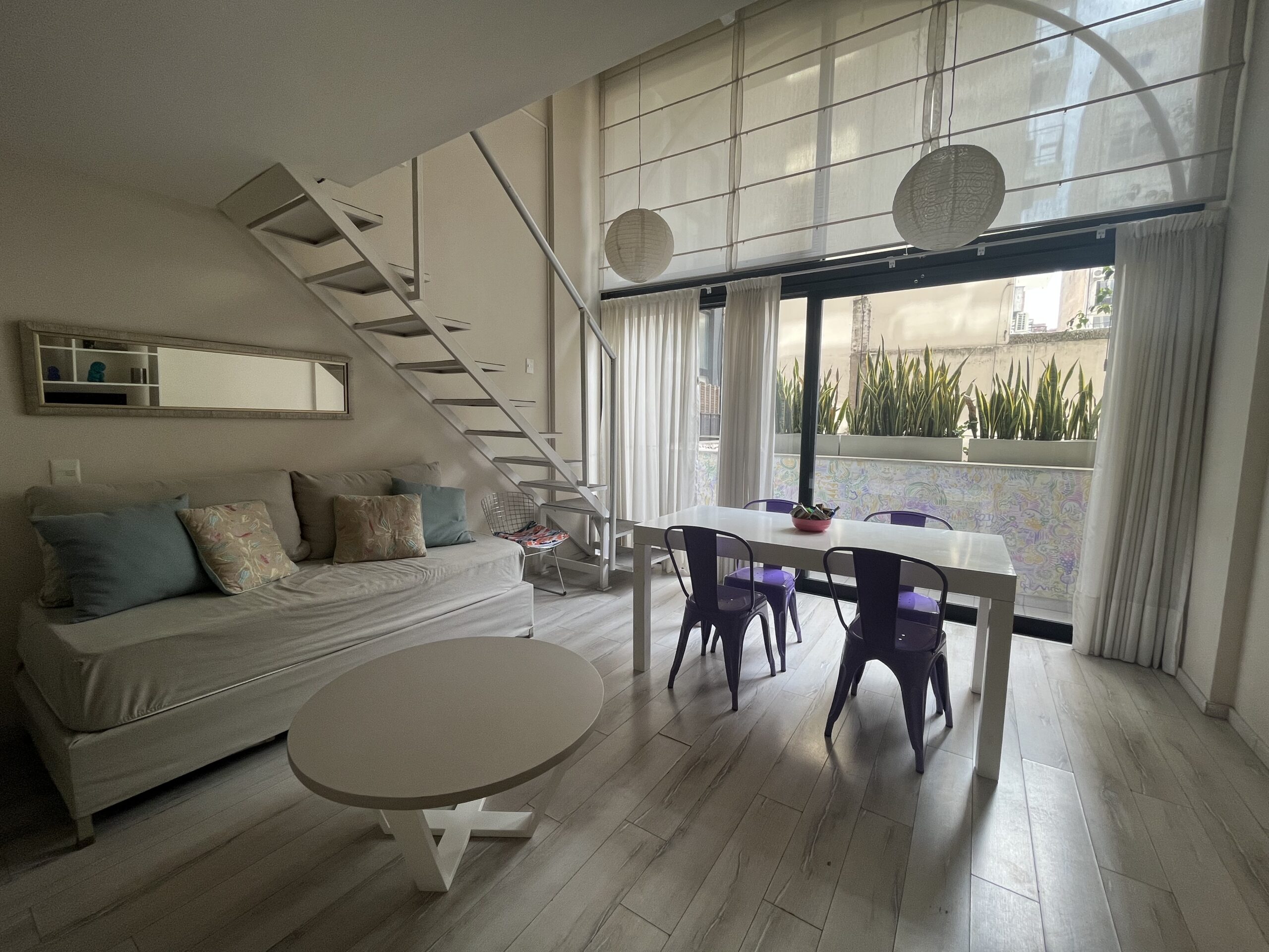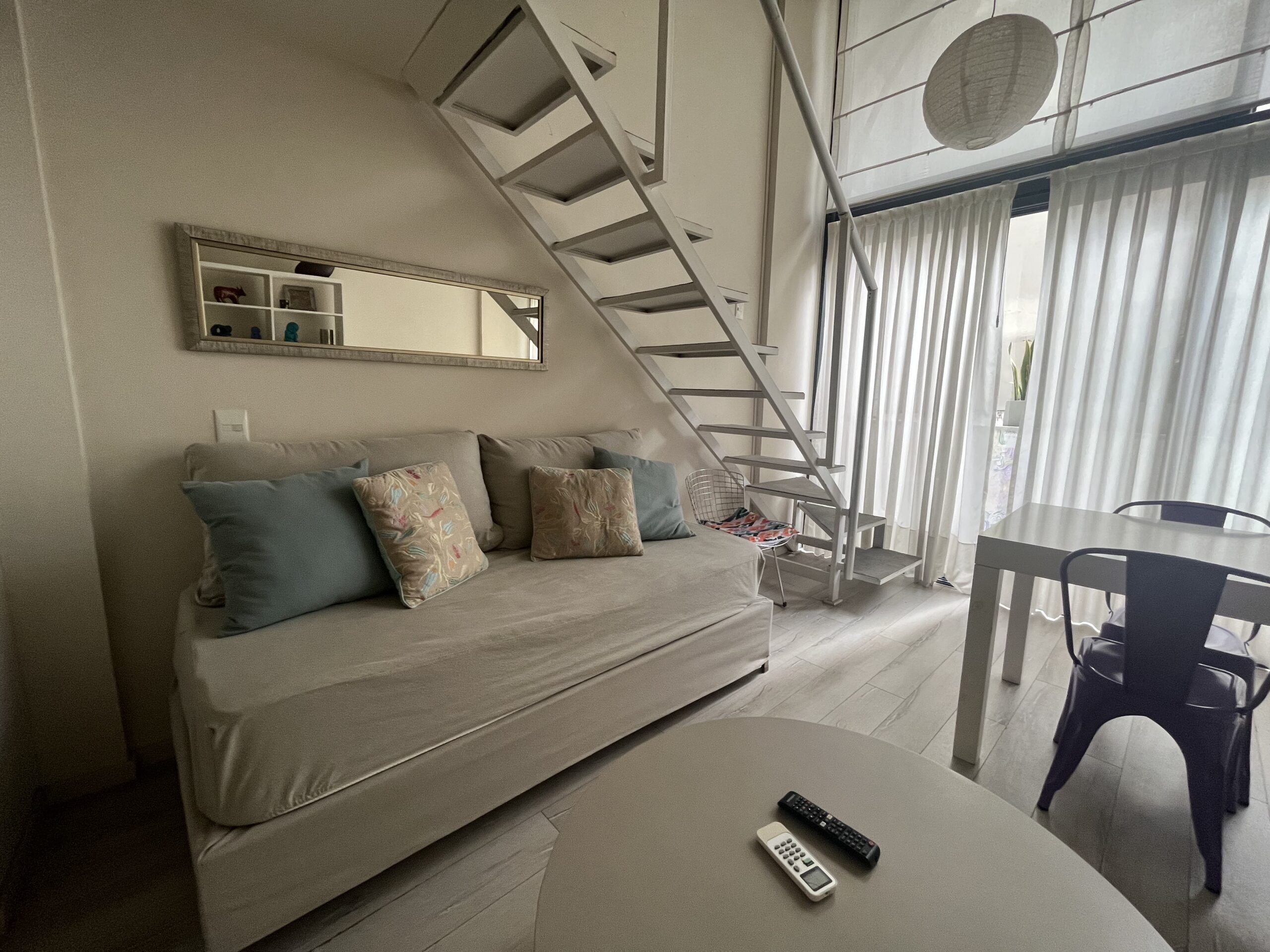 En la planta baja, el departamento ofrece un living-comedor con ventanales amplios, sofá cama y cocina completamente equipada y un toilette. En la planta alta, el dormitorio tipo loft cuenta con una cama queen size, TV , espacio de guardado y baño completo.