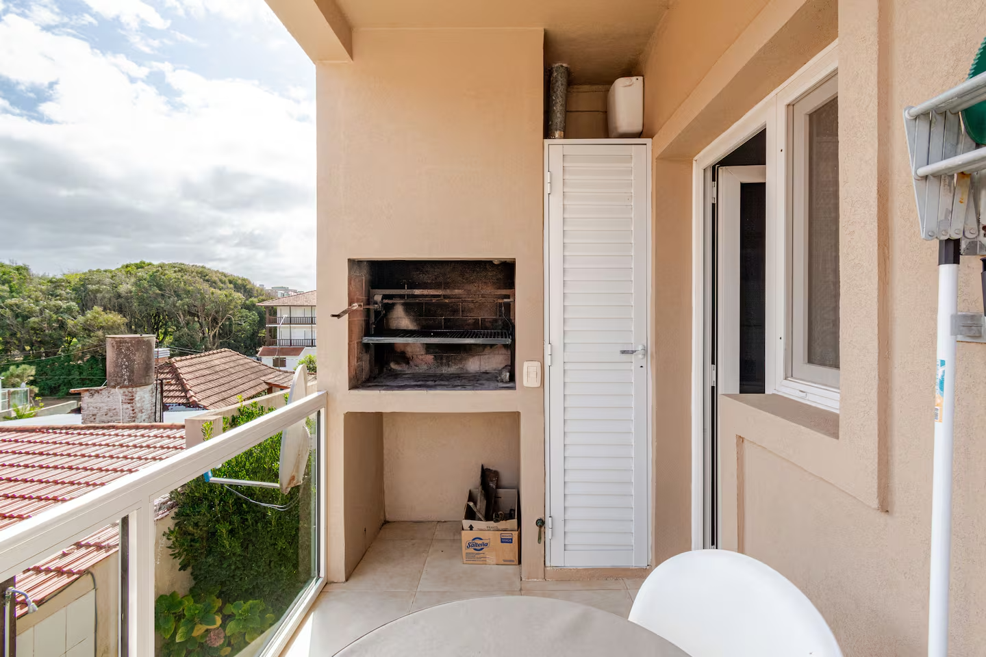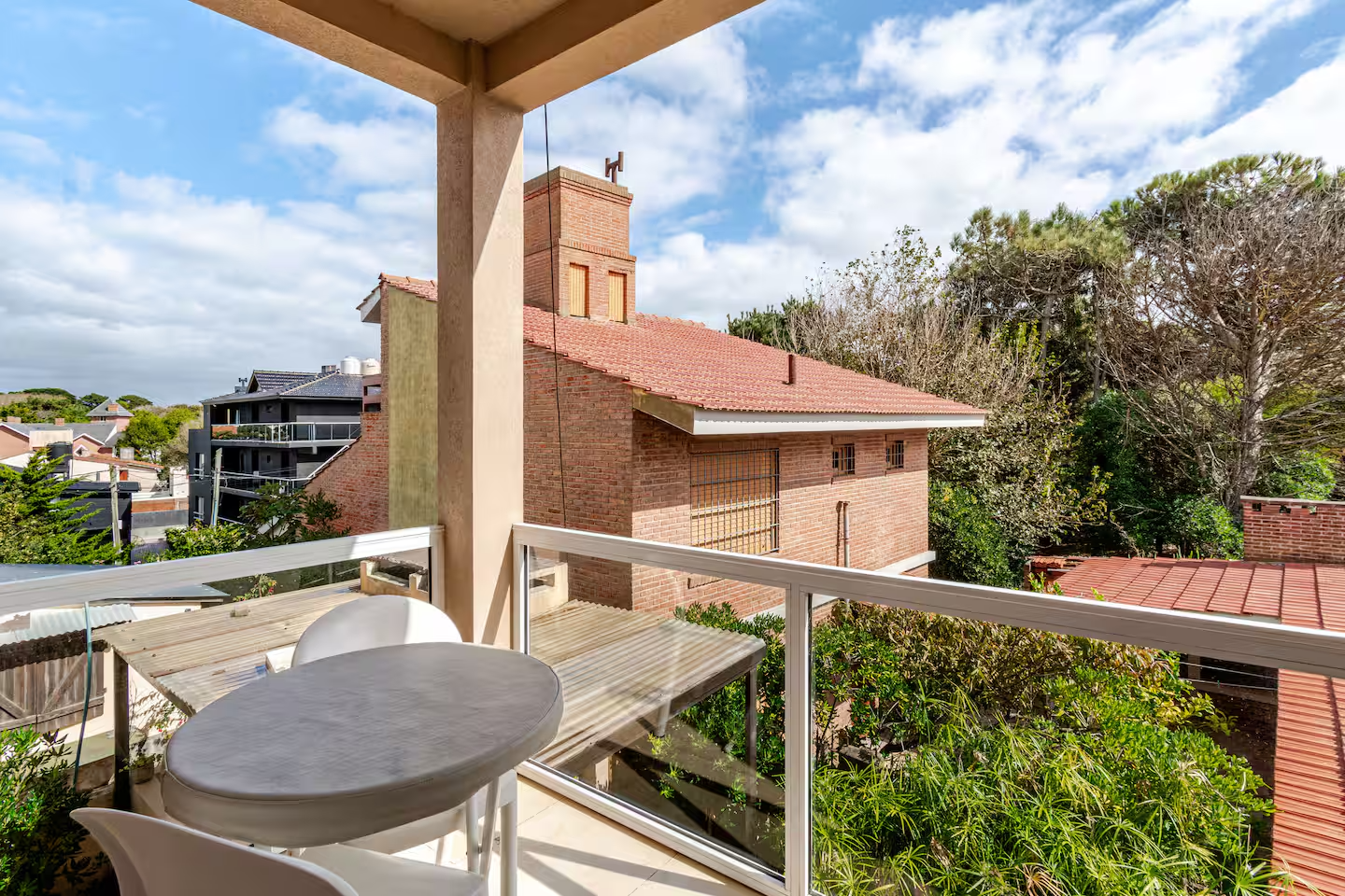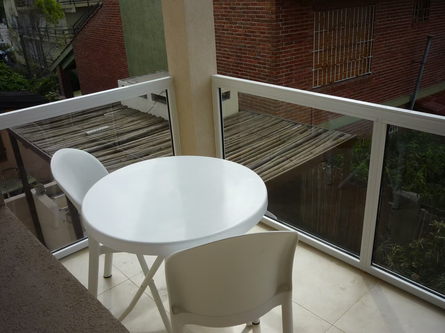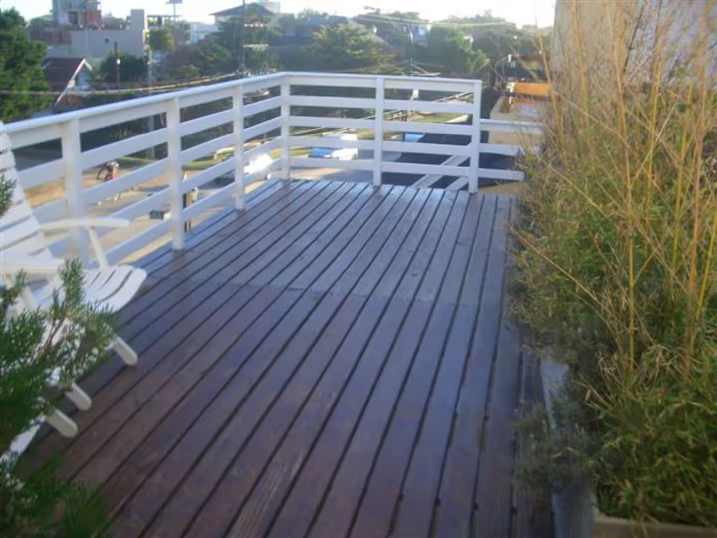 El Deck de ingreso a los departamentos, cuenta con sillas, mesa y reposera, para ser usada por los inquilinos.