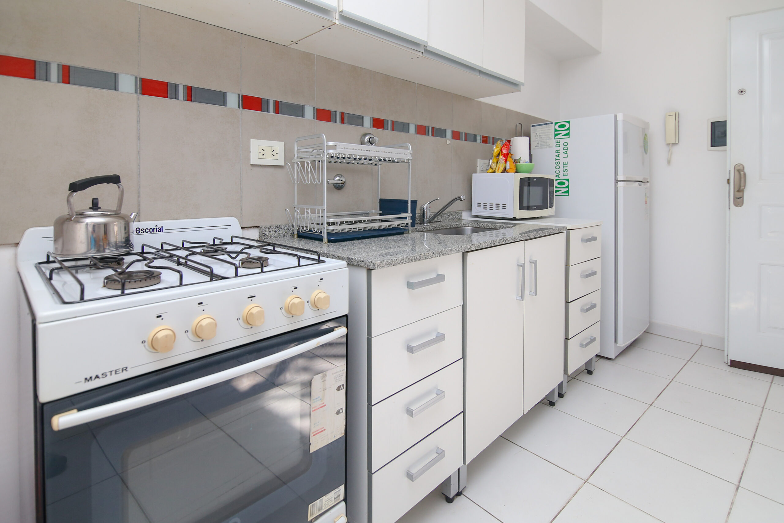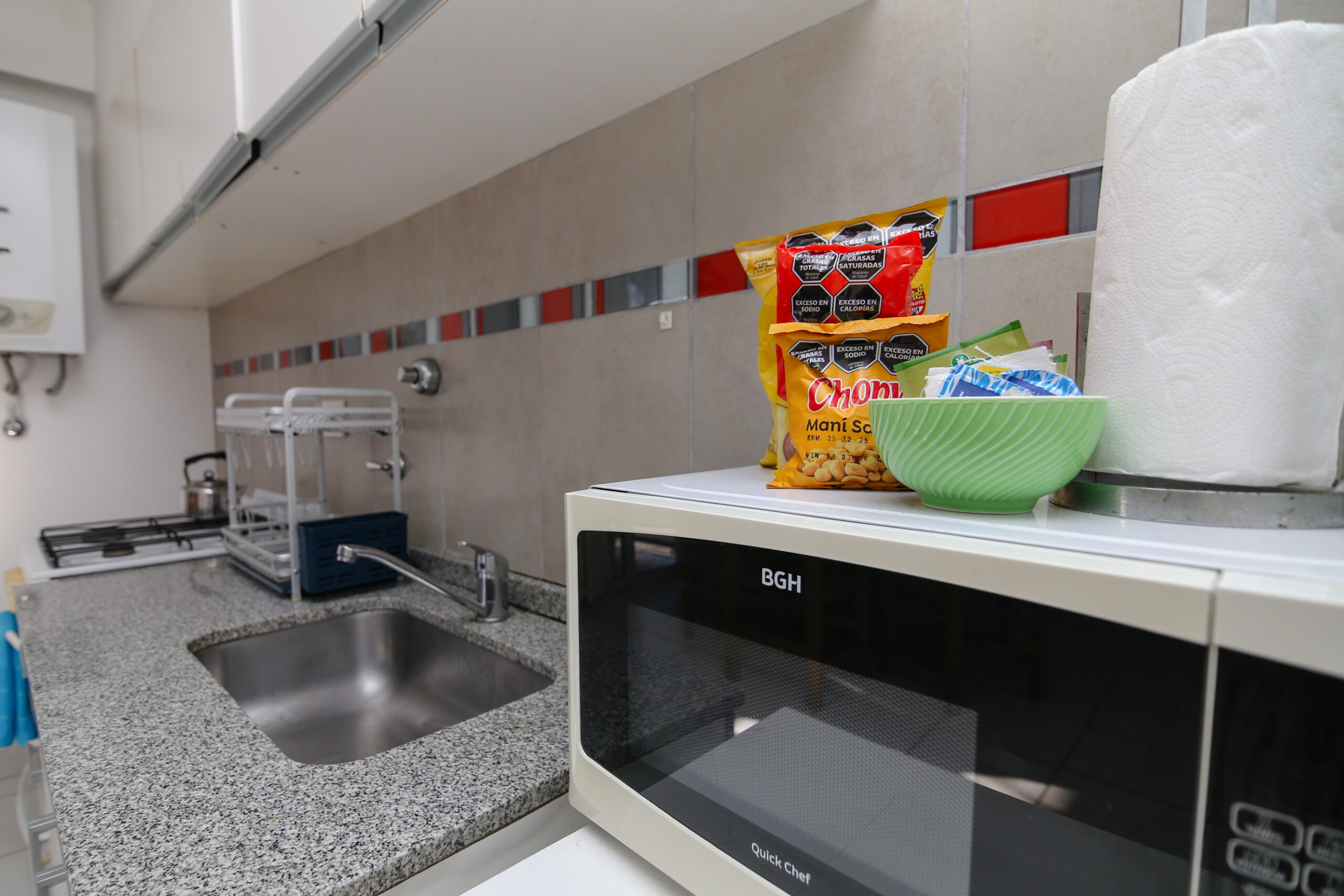Cocina con heladera, horno, microondas y todos los utensillos para cocinar y tener una estadía cómoda.